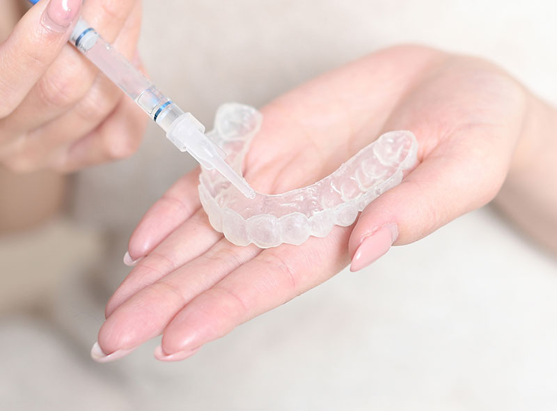 ご自宅で自分のペースで進められるホワイトニング方法です。患者様専用のマウスピースを作製し、薬剤を注入して毎日一定時間装着します。時間をかけて徐々に白くしていくため、自然な仕上がりになります。通院回数を抑えたい方に適しています。