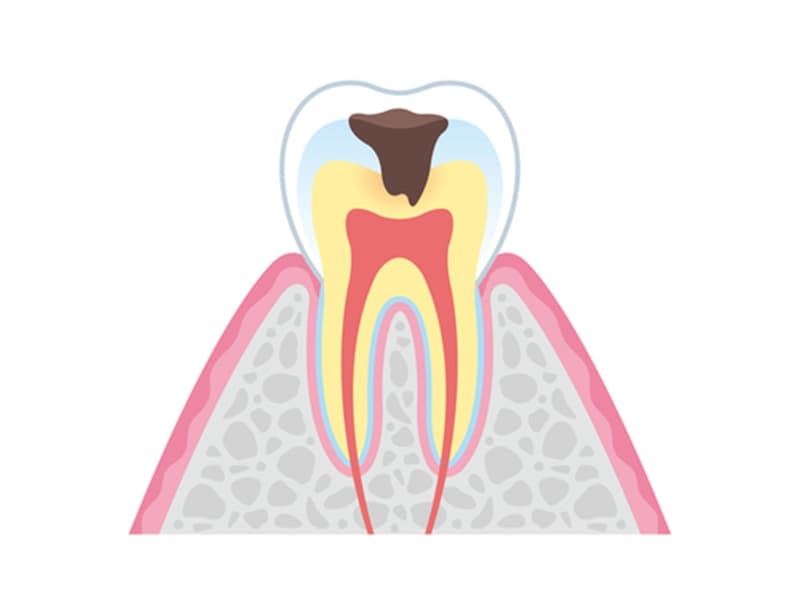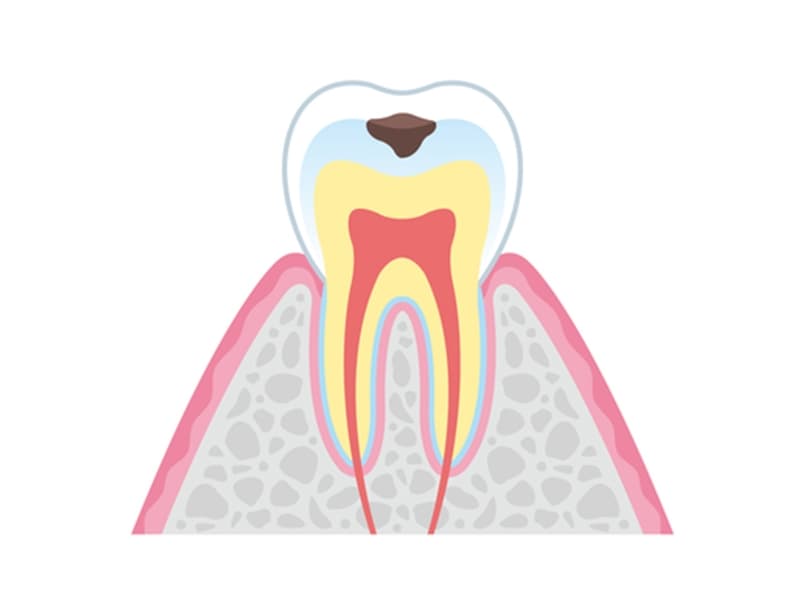 むし歯がエナメル質に到達すると、歯の表面に小さな穴が形成されるのが特徴です。この段階では、感染歯質を除去し、適切な修復材料で歯を修復しなければなりません。症例によっては、経過観察を選択することもありますが、一般的には早期の介入が推奨されます。